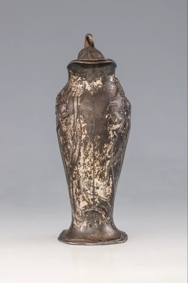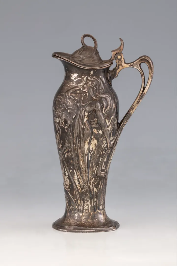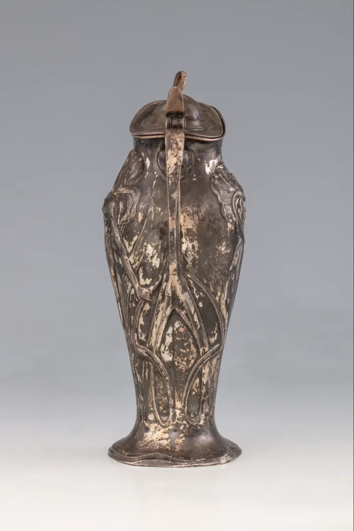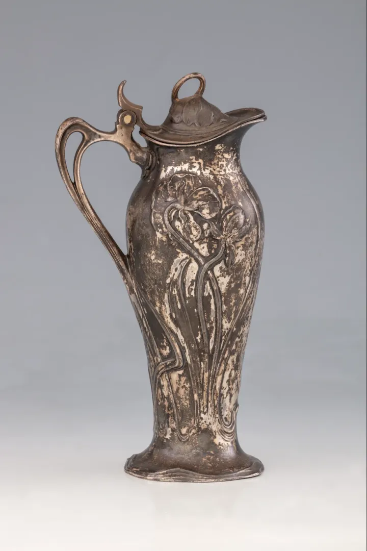 Elegáns, bécsi szecessziós stílusú ón kancsó a 1900 körüli időszakból. Finom arányai és letisztult formavilága a századforduló kifinomult ízlését tükrözi. Jelzett darab, Albert Köhler & Cie műhelyéből. Gyűjtőknek és enteriőr díszítésére egyaránt különleges választás.