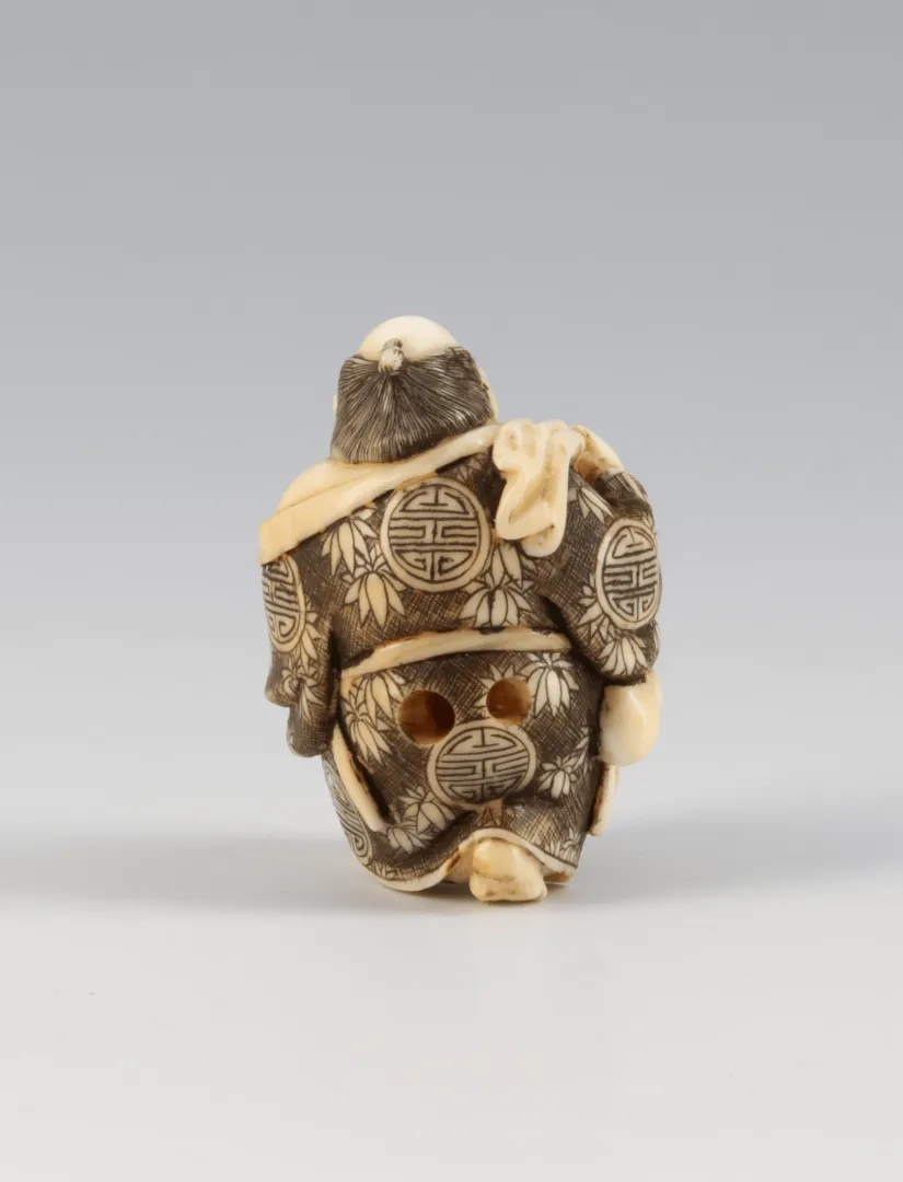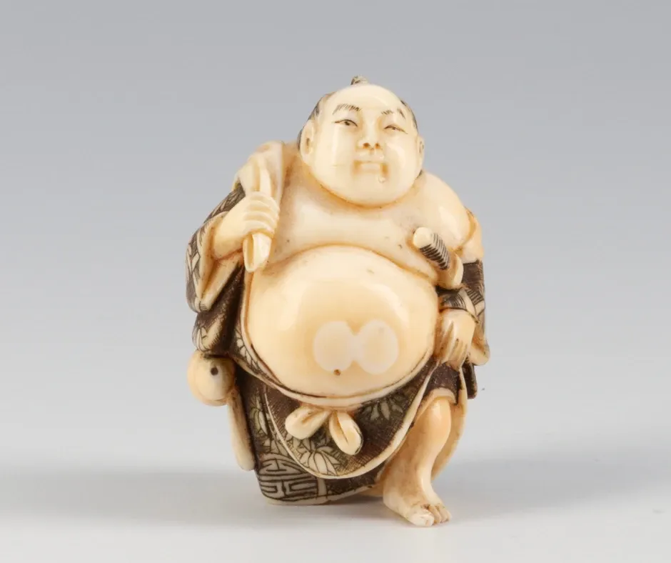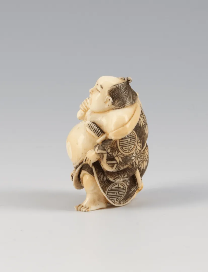 Ez a különleges, kézzel faragott netsuke egy jókedvű, kövér férfialakot – nagy valószínűséggel Hoteit – ábrázolja, aki a japán kultúrában a bőség és vidámság szimbóluma. A netsukék apró, funkcionális szobrocskák voltak, melyeket hagyományos japán ruházatra kötöttek, és a 17–19. században virágzott a készítésük művészi formában.
