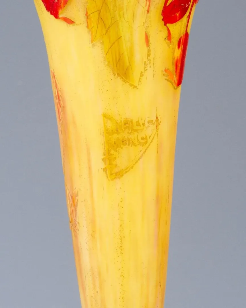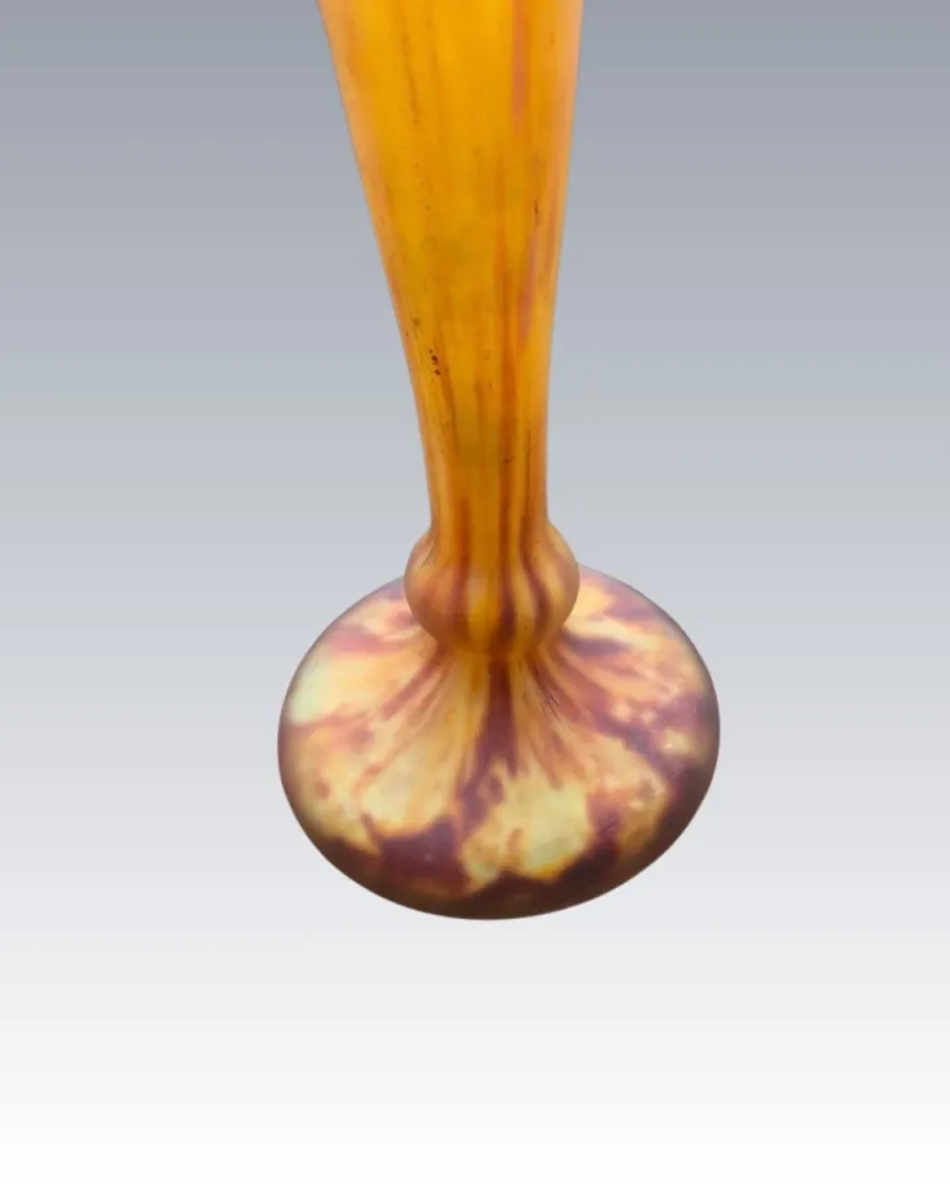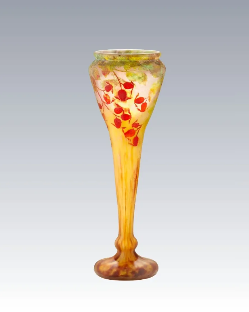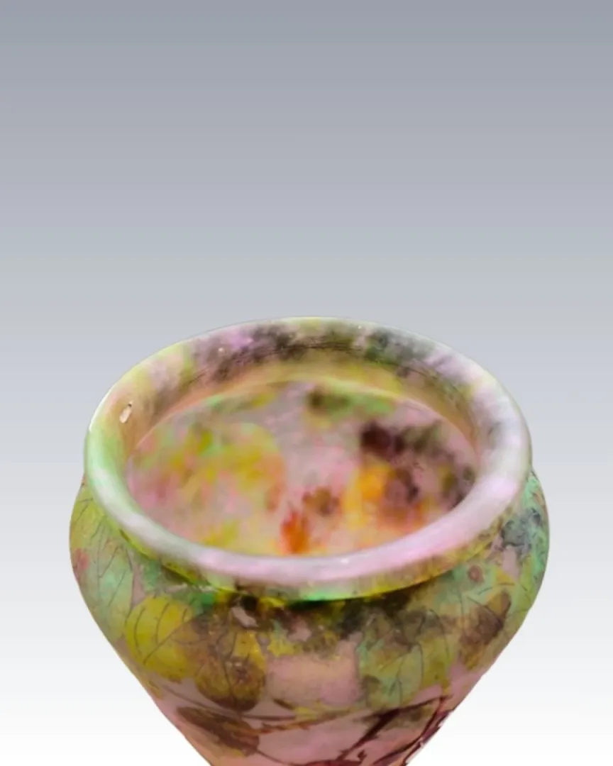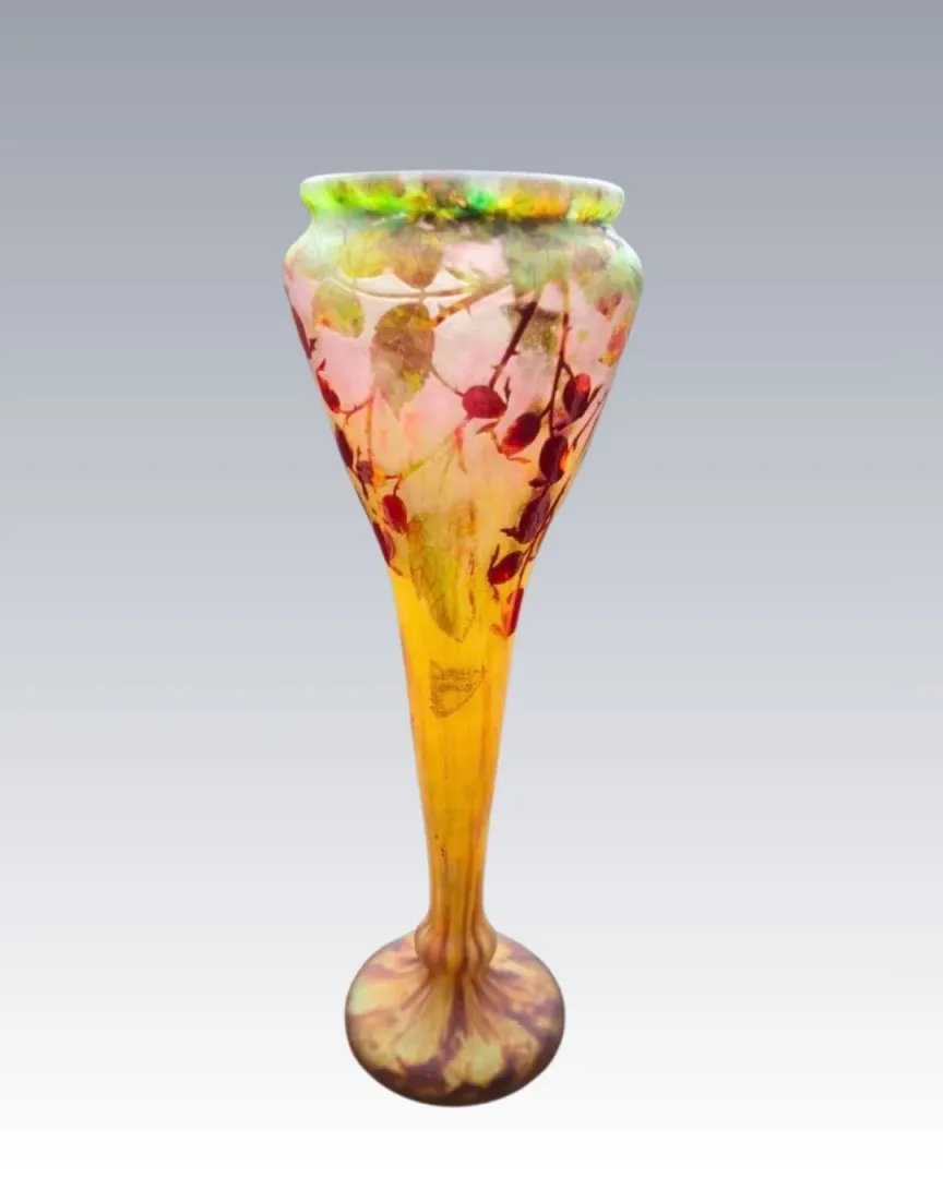 Elegáns, 1900 körüli szecessziós üvegváza a híres Daum & Nancy műhelyből. A váza savmaratott, rétegelt technikával készült, finom csipkebogyós dekorral díszítve.