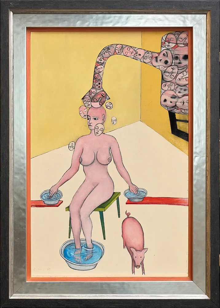 Az Arczuhany a művész karakteres, ironikus és szimbolikus világát tükrözi, markáns formavilággal és erőteljes vizuális hatással.Technika: olaj, farost