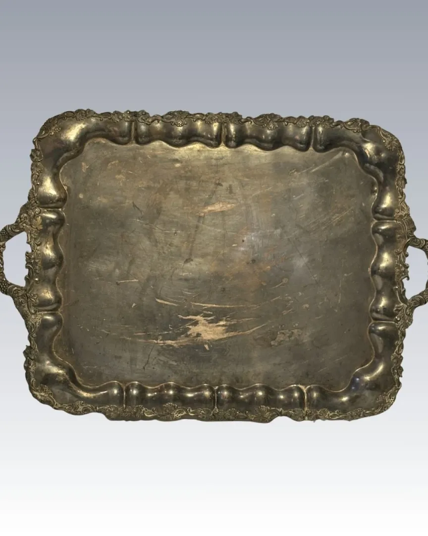Ezüstözött ón füles tálca, peremén szőlőlevél motívumokkal.