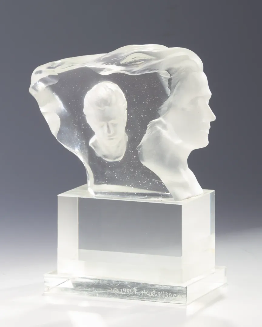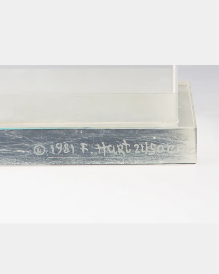Ez az 1981-es üveg szobor különleges formavilágú, emberi fejeket ábrázoló részletekkel. A darab jelzett, szignált és datált, garantálva az eredetiséget és a művészi értéket. Elegáns, dekoratív darab, amely kitűnő kiegészítője lehet bármely gyűjteménynek.