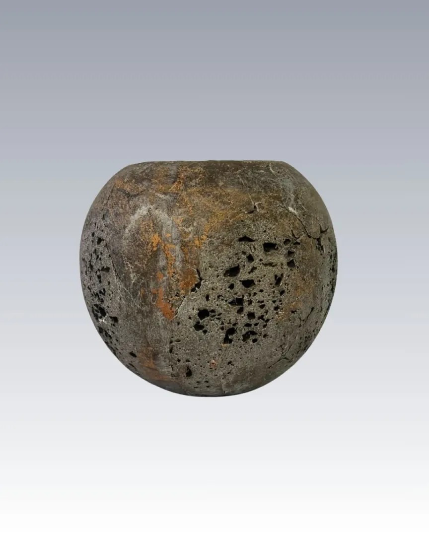 Gorka Lívia keramikusművész jelzett samottos gömbváza. A karakteres formájú, modern szemléletű kerámia a magyar iparművészet kiemelkedő alkotójának munkája.