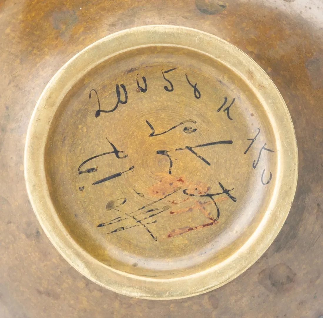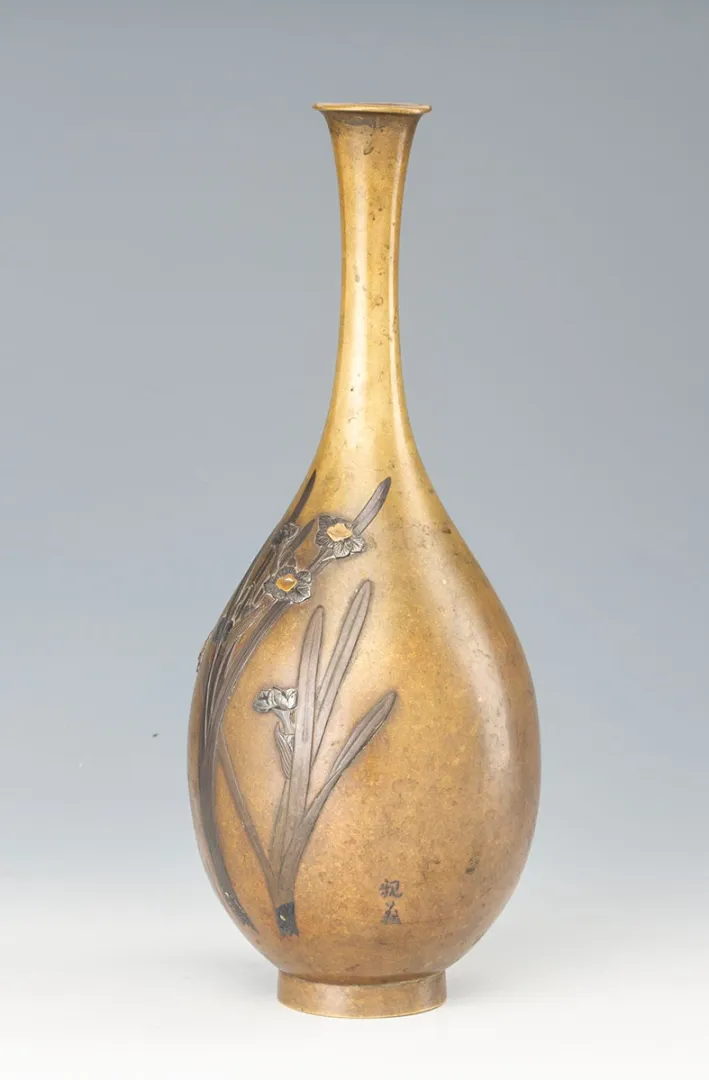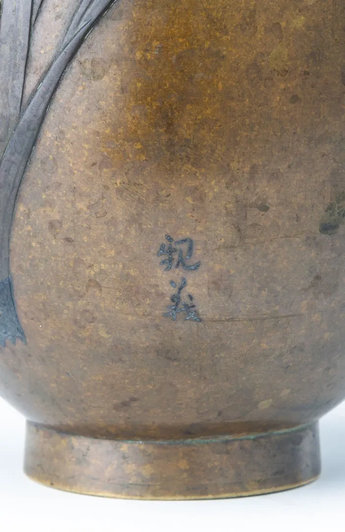 Eredeti japán bronzváza a Meiji periódusból, stilizált növényi és madármotívumokkal díszítve. Finoman kidolgozott, dekoratív darab, amely a korszak jellegzetes művészi stílusát tükrözi.