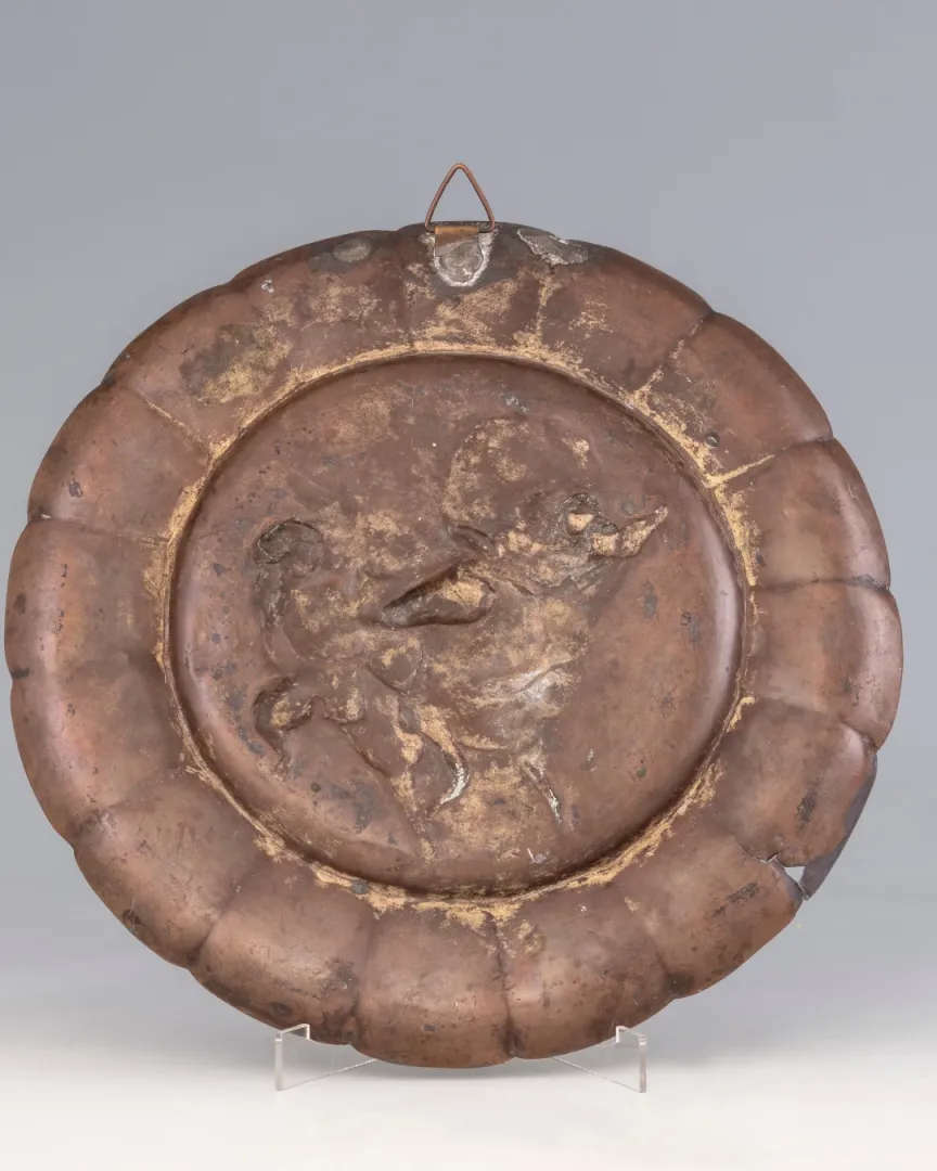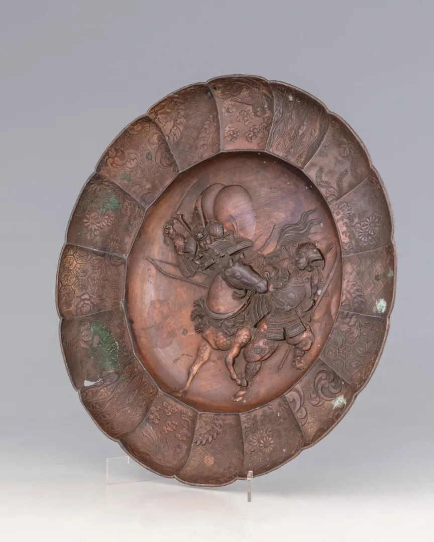 Japán vörösréz falitányér a Meiji korból (1868–1912), harcoló szamurájokat ábrázoló jelenettel. Részletgazdag kivitelezése és történelmi háttere miatt különösen értékes gyűjtői darab.