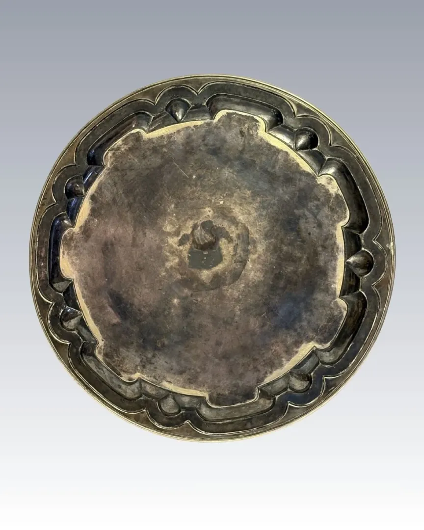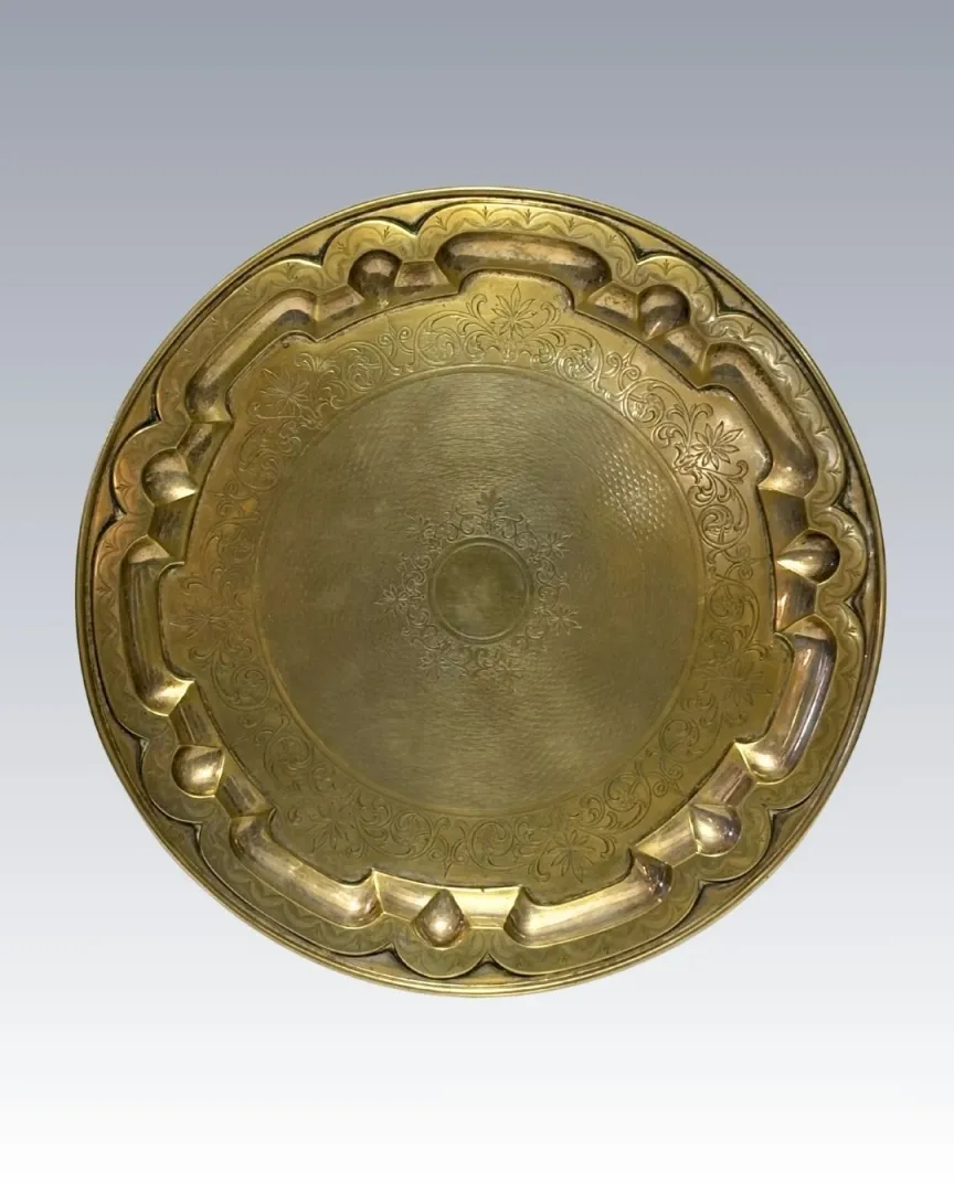Ezüstözött alpakka kerek tálca, teljes felületén vésett és cizellált motívumokkal.