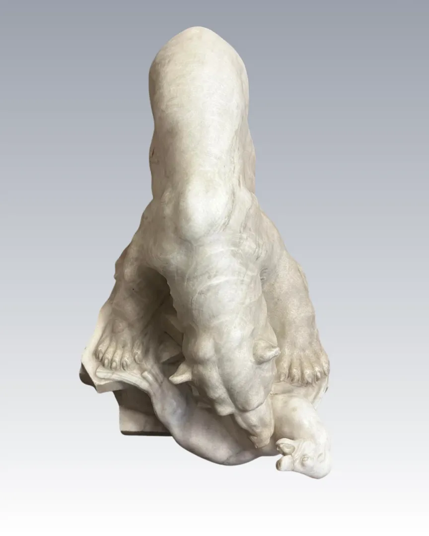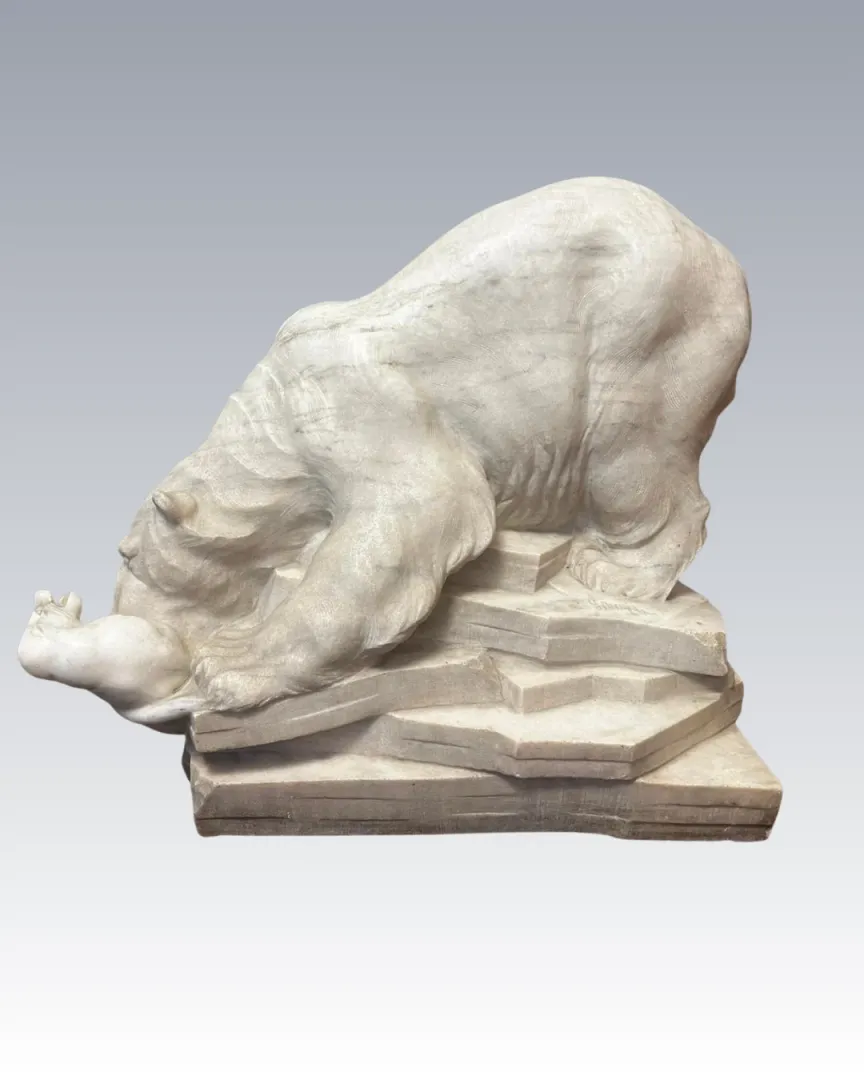 A plasztika egy fókát elejtő jegesmedvét ábrázol, részletgazdag, erőteljes kompozícióban.