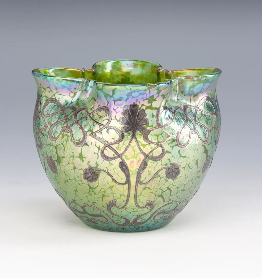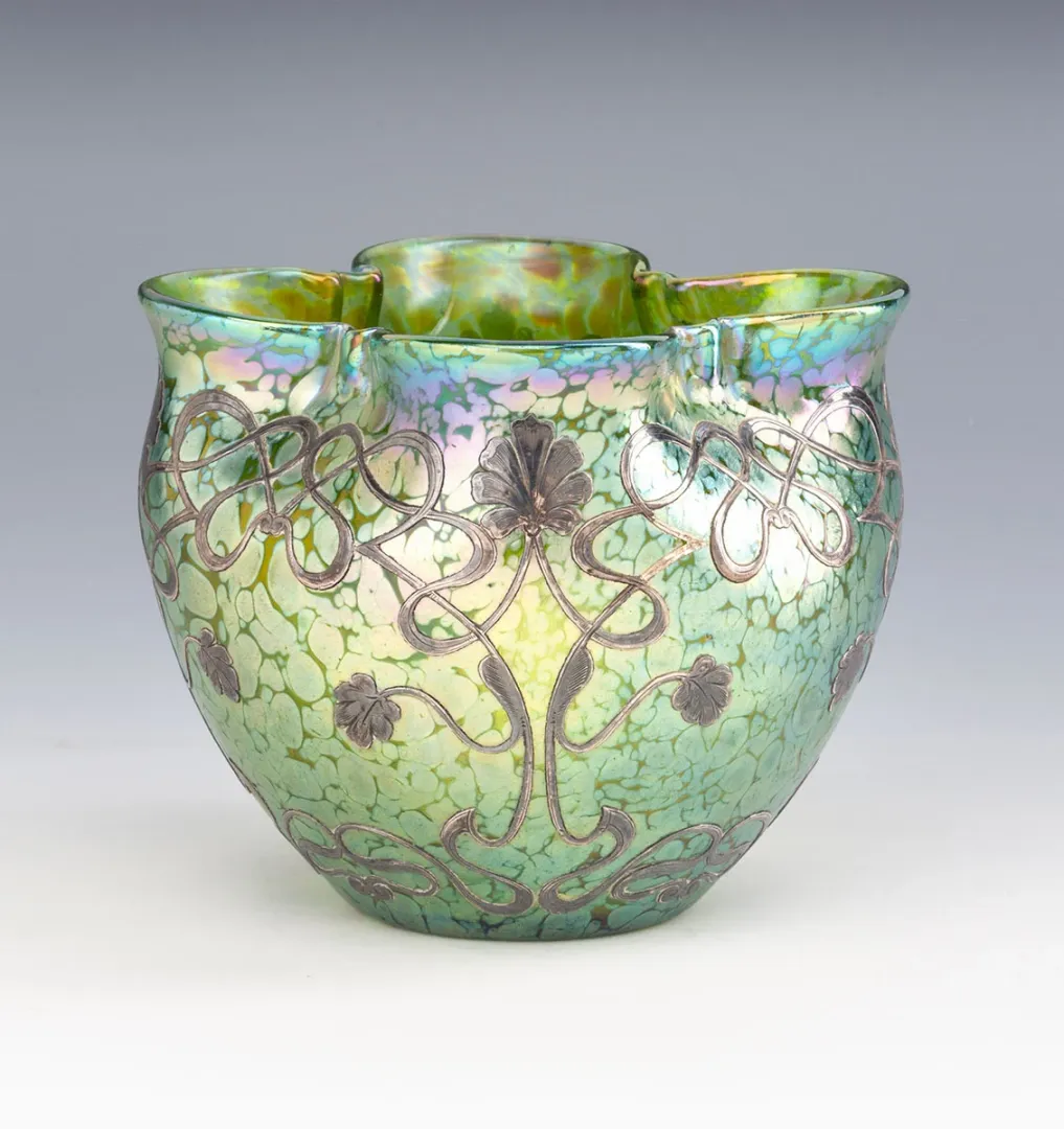 Eredeti Loetz Witwe Klostermühle szecessziós üvegkaspó, finom florális motívumokkal és elegáns ezüstberakással díszítve.