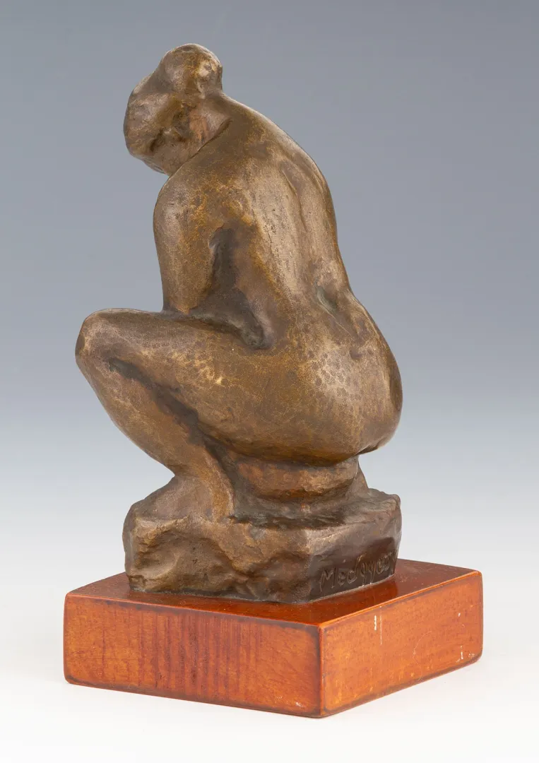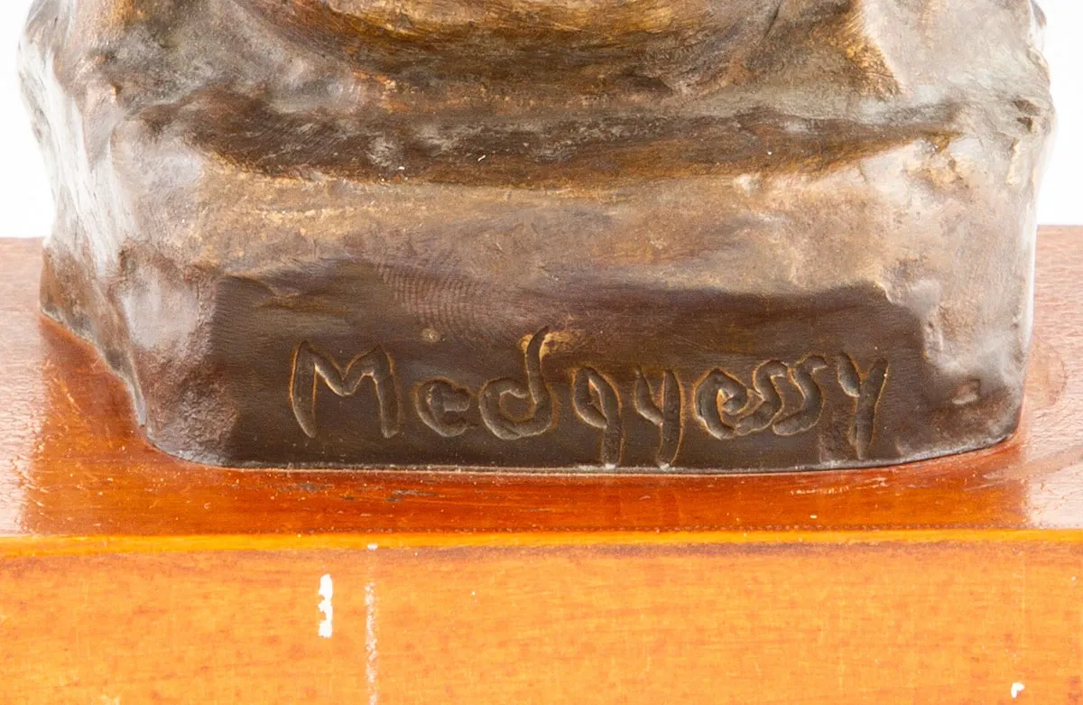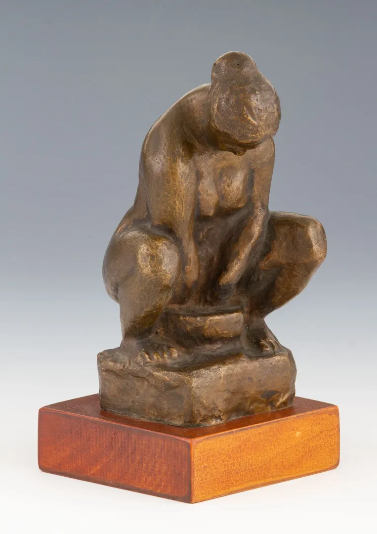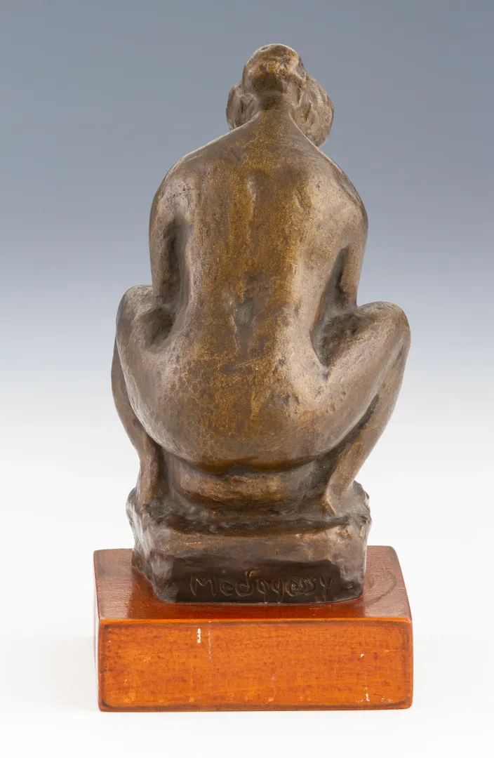 Öntött, patinázott bronzszobor, eredeti fa talapzatán.
