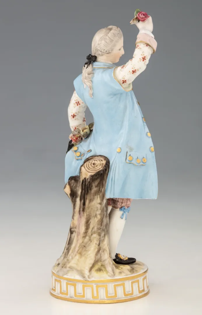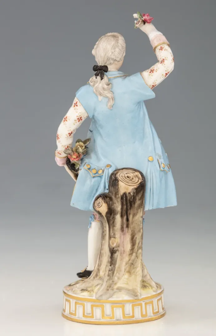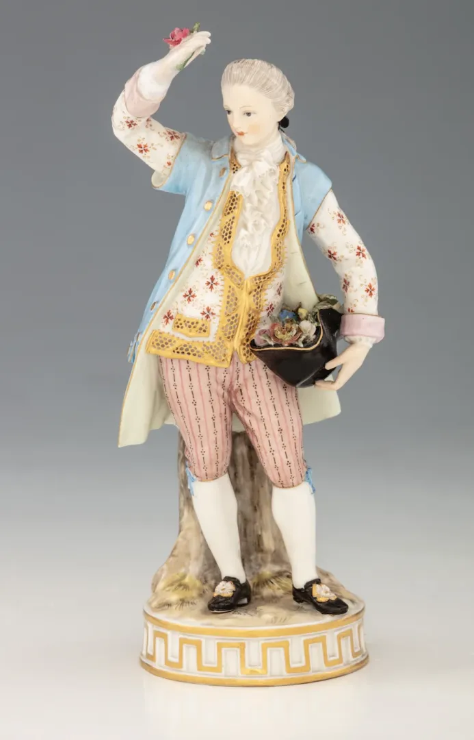 Meissen porcelán figura – Kék kabátos rokokó alak, kalapjában virágokkal
