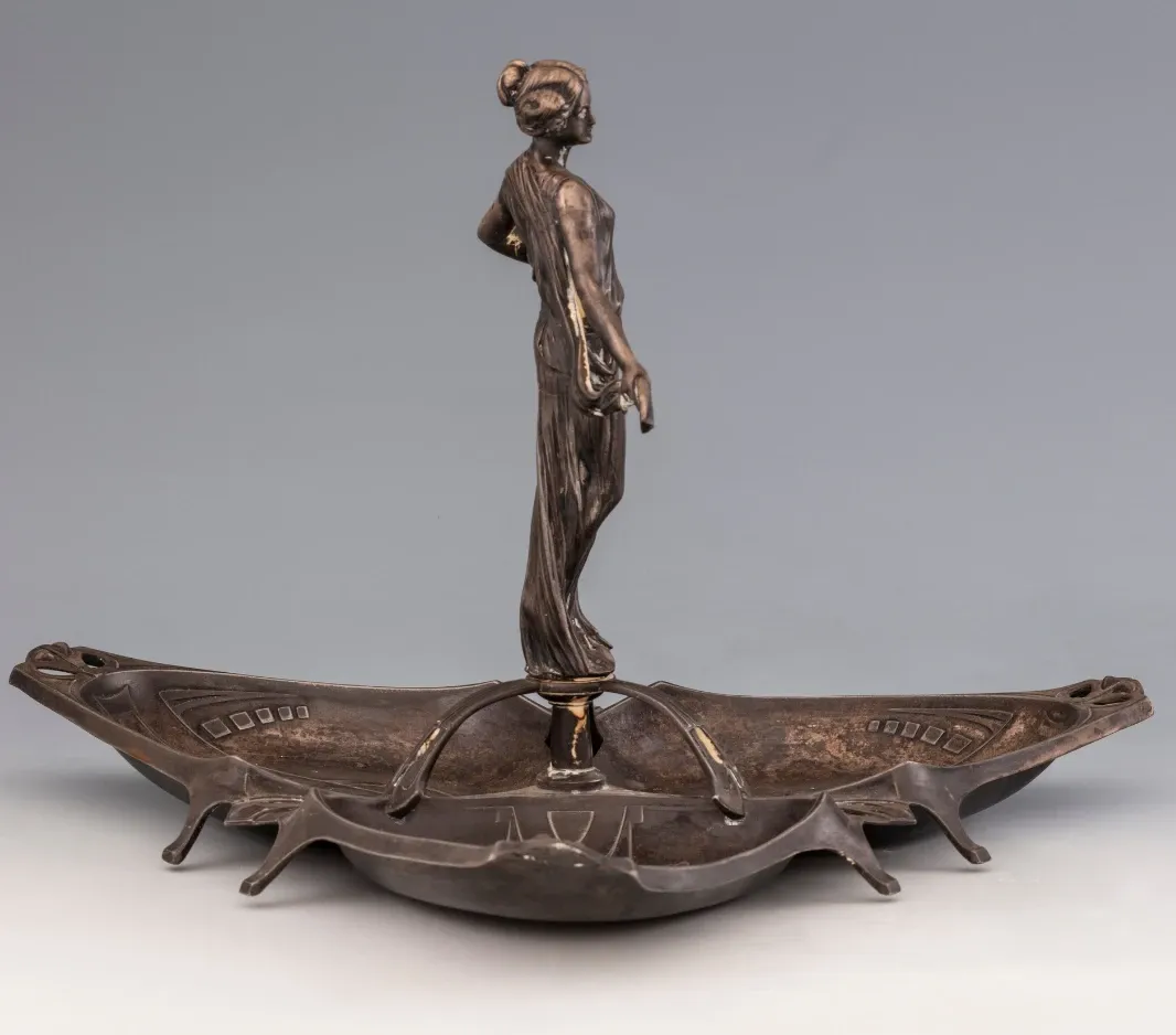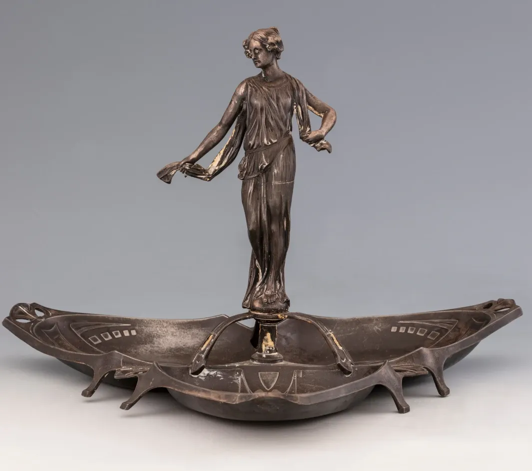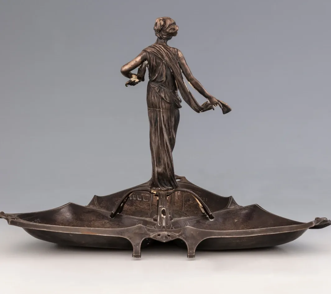 Figurális díszítésű szecessziós ón kínáló a századforduló időszakából. Arányos mérete és részletgazdag kialakítása különleges hangulatot teremt.